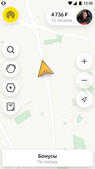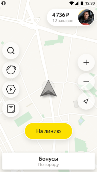 Готовы к поездкам — жмите жёлтую кнопку в центре. Она свернётся в кружок в левом верхнем углу экрана — и вам начнут поступать заказы.